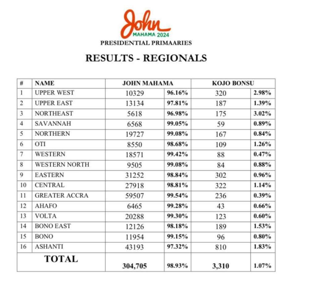Former President Mahama also Polled 10,329 votes in the Upper West Region which is 96.16% whilst Kojo Bonsu Polled 320 votes making 2.98%.