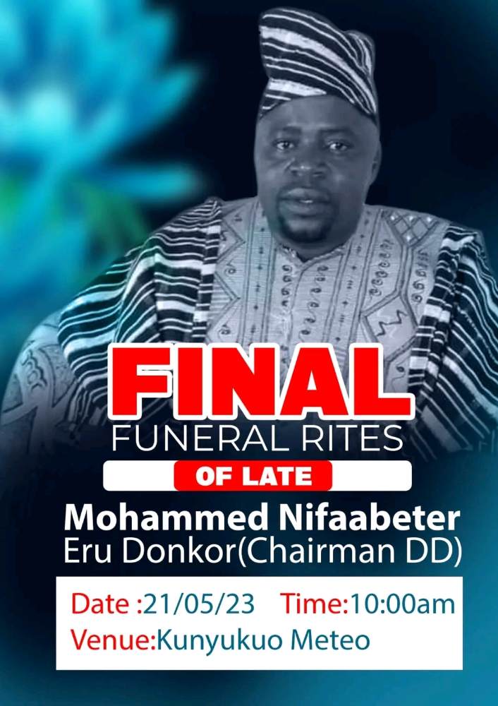 Former Constituency Chairman of Lawra, Alhaji Mohammed Nifaabeter Donkor Passed on 10th May 2023 and his Final Funeral Rite shall be held on 21st of May 2023 at Kunyukuo Meteo in the Lawra Municipality.
