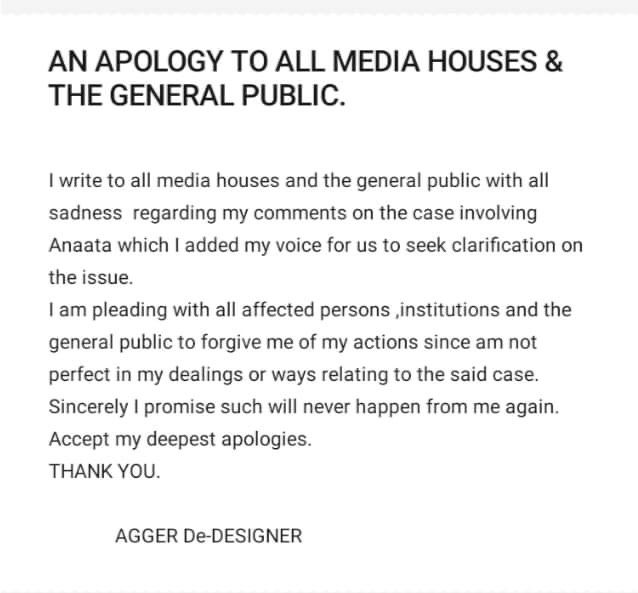 The Apology note Released on behalf of Agga De Designer was shared by Napoleon Derry, a showbiz personality in the Upper West Region.