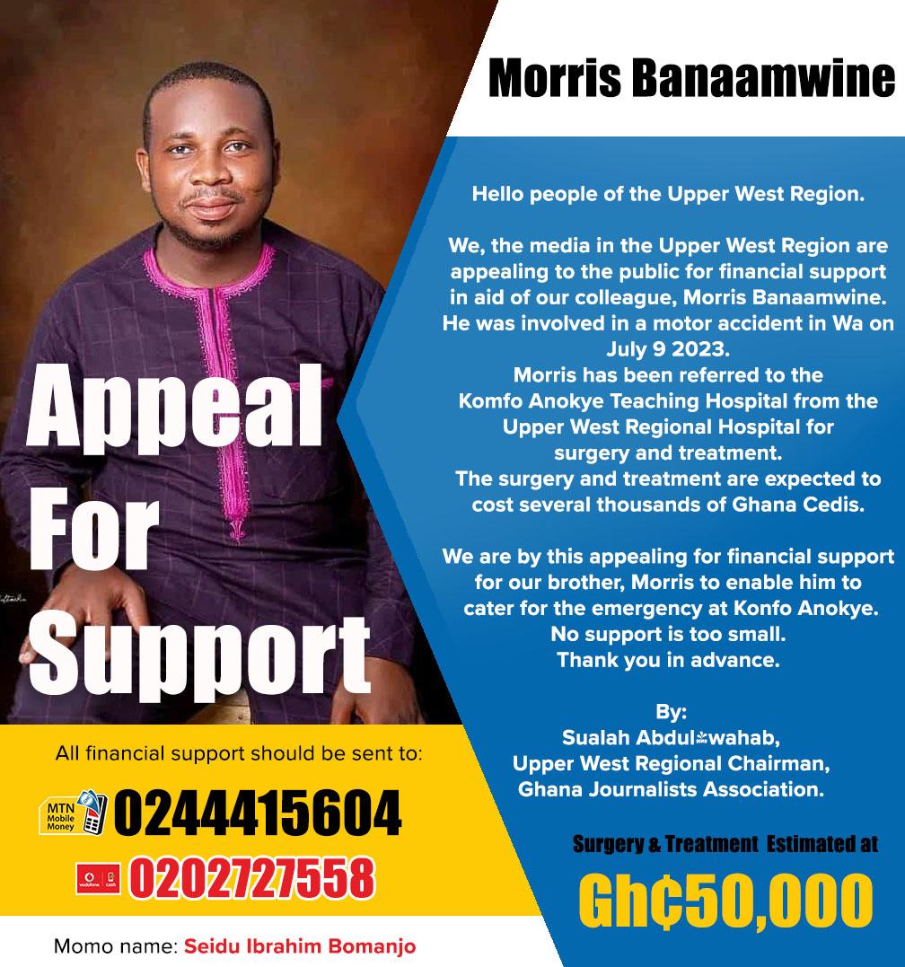 A Corresponding Journalist of EiB network and General Manager of Radio Waa Media, Mr Morris Banaanwine has been Referred to Okomfo Anokye Teaching Hospital from the Upper West Regional Hospital on 10th of July 2023 after he was involved in a Terrible Accident.