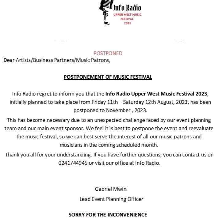 Info Radio regret to inform you that the Info Radio Upper West Music Festival 2023, initially planned to take place from Friday 11th-Saturday 12th August, 2023, has been postponed to November, 2023.