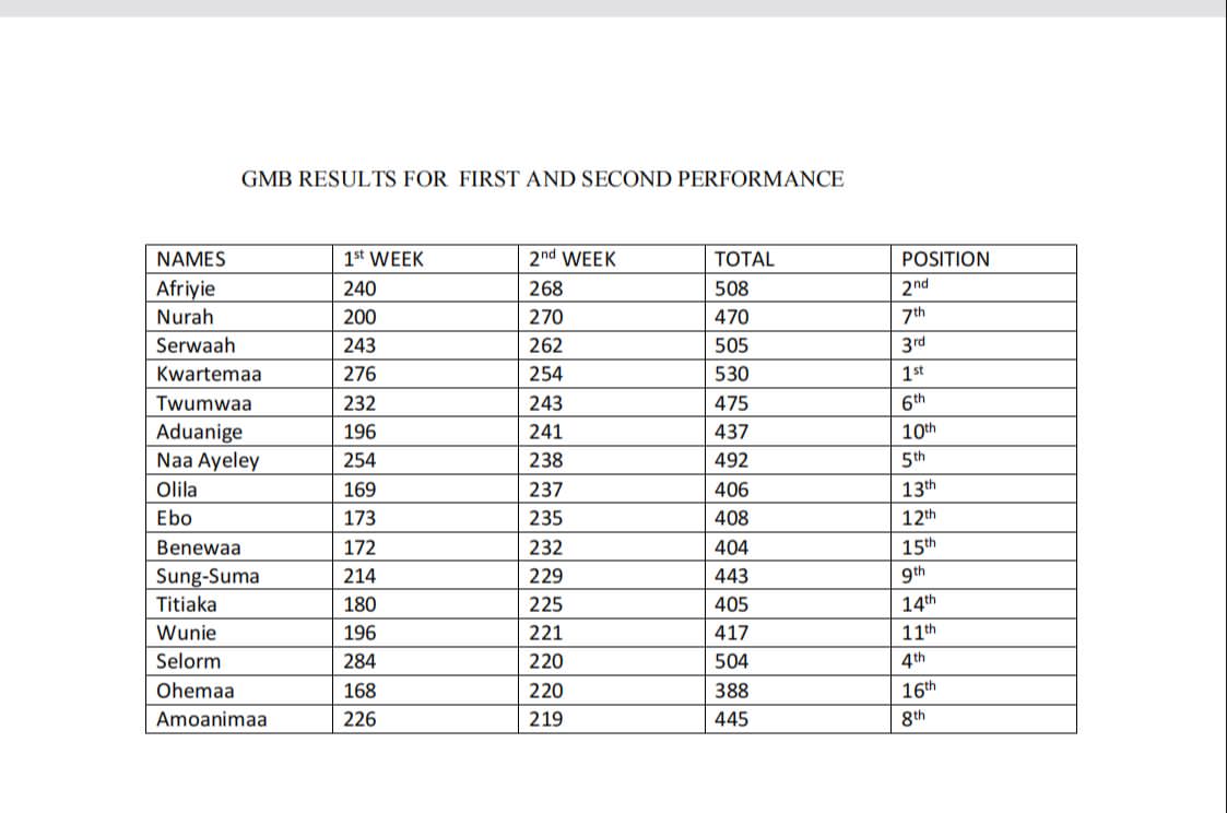 Also in the List, Ohemaa Representing the Bono East Region was 16th with 388 Score whilst Kwartemaa from Bono Region was rated First with 530 score.
