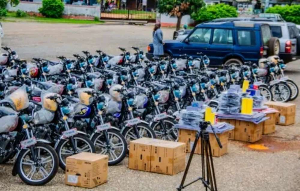 Upper West Regional minister, Dr. Bin Salih Hafiz presented motorbikes and some office equipment to 6 Assemblies at the forecourt of the RCC.