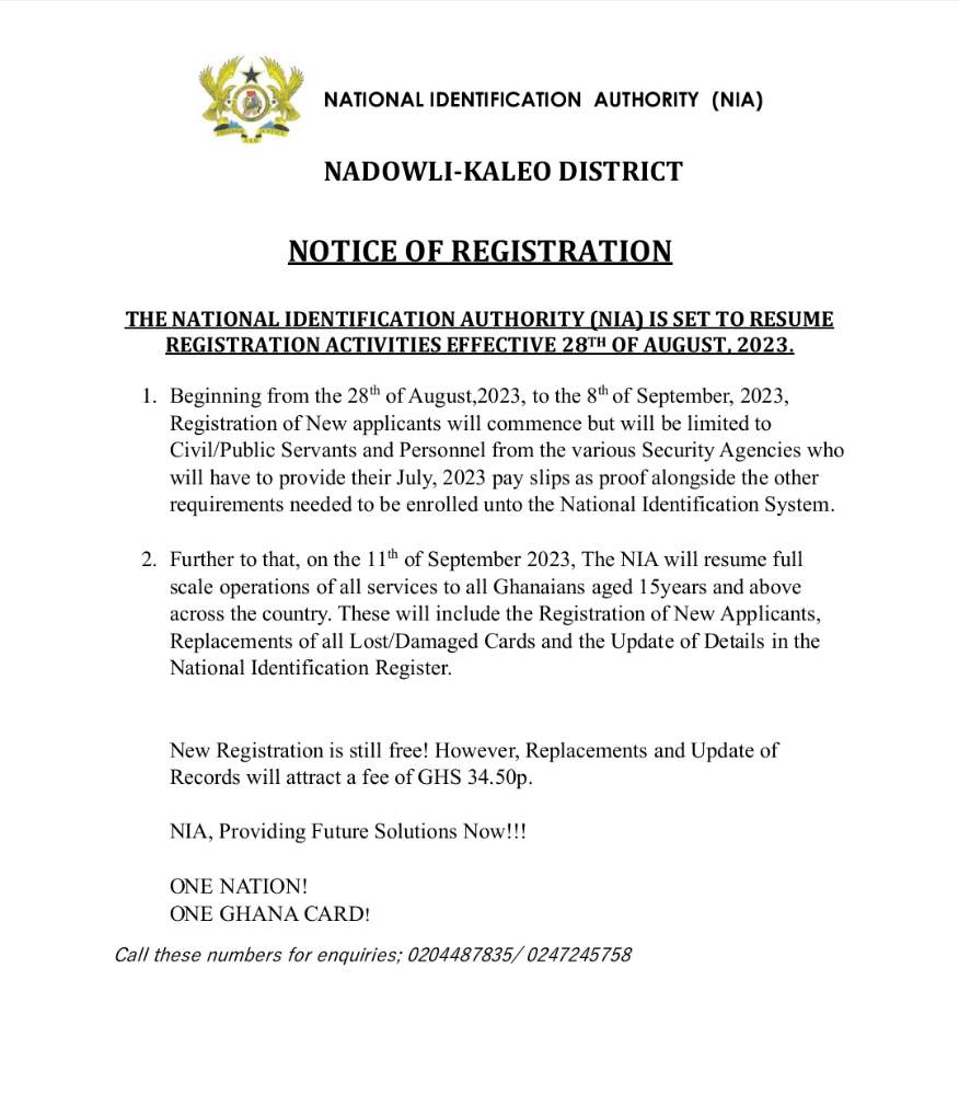 The National Identification Authority (Nia) Is Set To Resume Registration Activities Effective 28th Of August, 2023.
