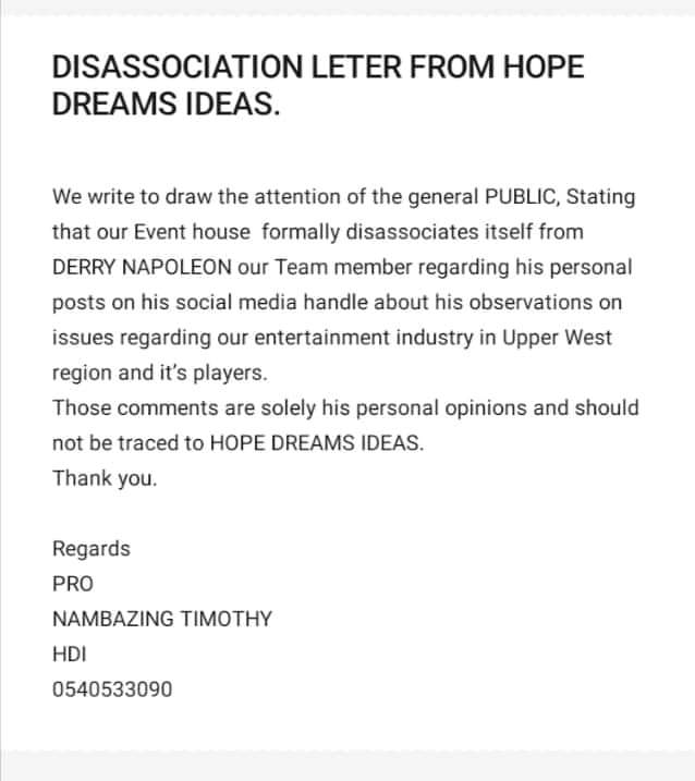 We write to draw the attention of the general PUBLIC, Stating that our Event house formally disassociates itself from DERRY NAPOLEON our Team member regarding his personal posts on his social media handle about his observations issues regarding our entertainment industry in Upper West region and it’s players.