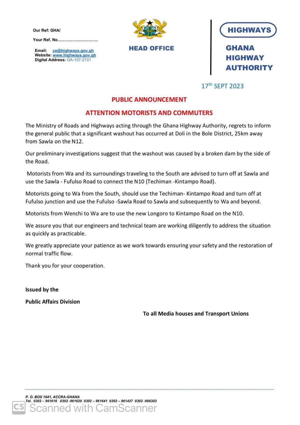 The Ministry of Roads and Highways acting through the Ghana Highway Authority, regrets to inform the general public that a significant washout has occurred at Doli in the Bole District, 25km away from Sawla on the N12.