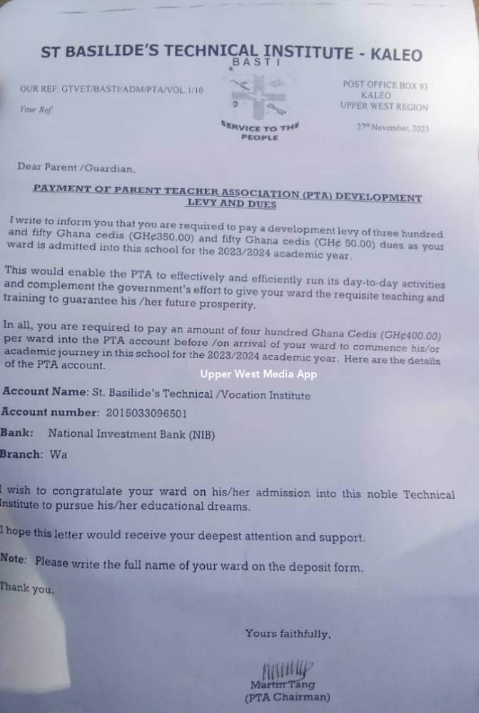 Students of St. Bastlide’s Technical Institute according to the School’s PTA have been issued notices to pay a Development Levy of Ghc350, an Amount Of Ghc400 is supposed to be paid into the School’s PTA Account before or on arrival of each student admitted to the Technical Institution under the Ghana TVET Service.
