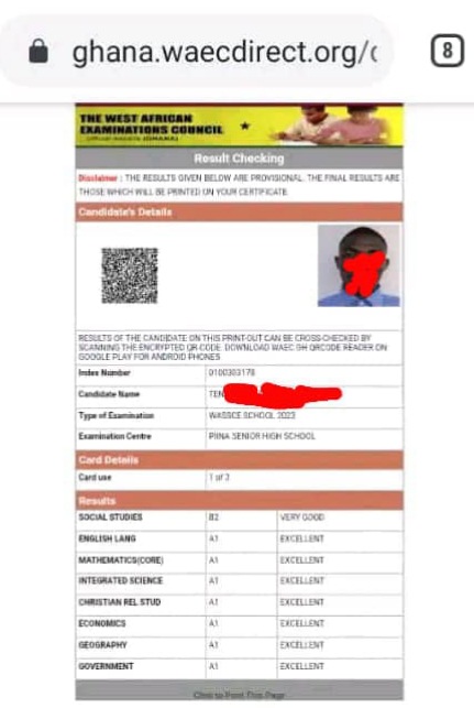With the Exception of Social Studies in which he obtained a B2, He had A1 in all other subjects including Core Mathematics, Integrated Science, English, Christian Religious Studies, Economics, Geography and Government.