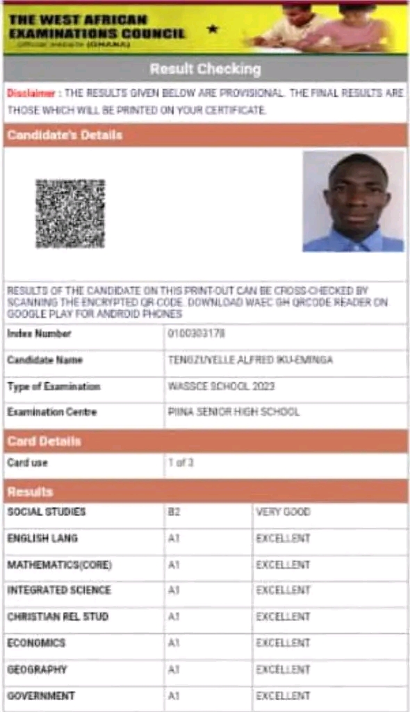 With the Exception of Social Studies in which he obtained a B2, He had A1 in all other subjects including Core Mathematics, Integrated Science, English, Christian Religious Studies, Economics, Geography and Government.