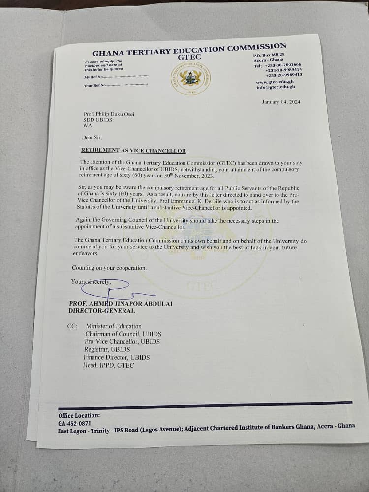 GTEC in a statement issued on January 4, 2024, said, “The attention of the Ghana Tertiary Education Commission (GTEC) has been drawn to your stay in office as the Vice-Chancellor of UBIDS, notwithstanding your attainment of the compulsory retirement age of sixty (60) years on 30th November, 2023