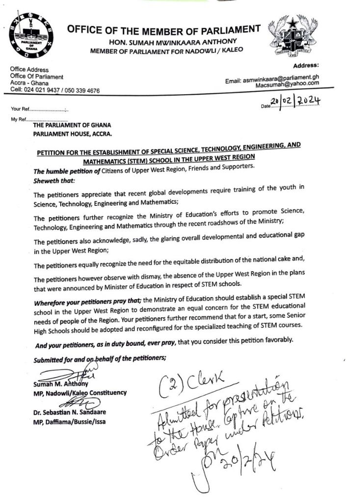 The Petition is jointly signed by the Members of Parliament for Nadowli/Kaleo and Daffiama-Bussie-Issa, Hon. Sebastian Sandaare. The petition emphasizes that the region lags behind in education and urges the government to prioritize the establishment of a STEM school to bring it up to par with other parts of the country.