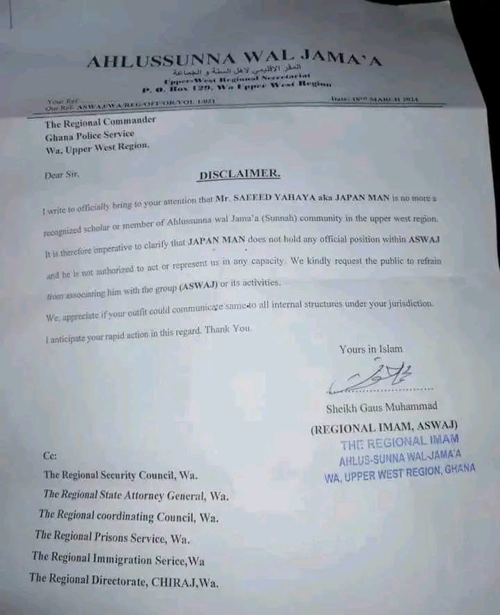 I write to officially bring to your attention that Mr SAEED YAHAYA aka JAPAN MAN is no more recognized scholar or member of Ahlassunna wal Jama’a (Sunai) community in the upper west region.