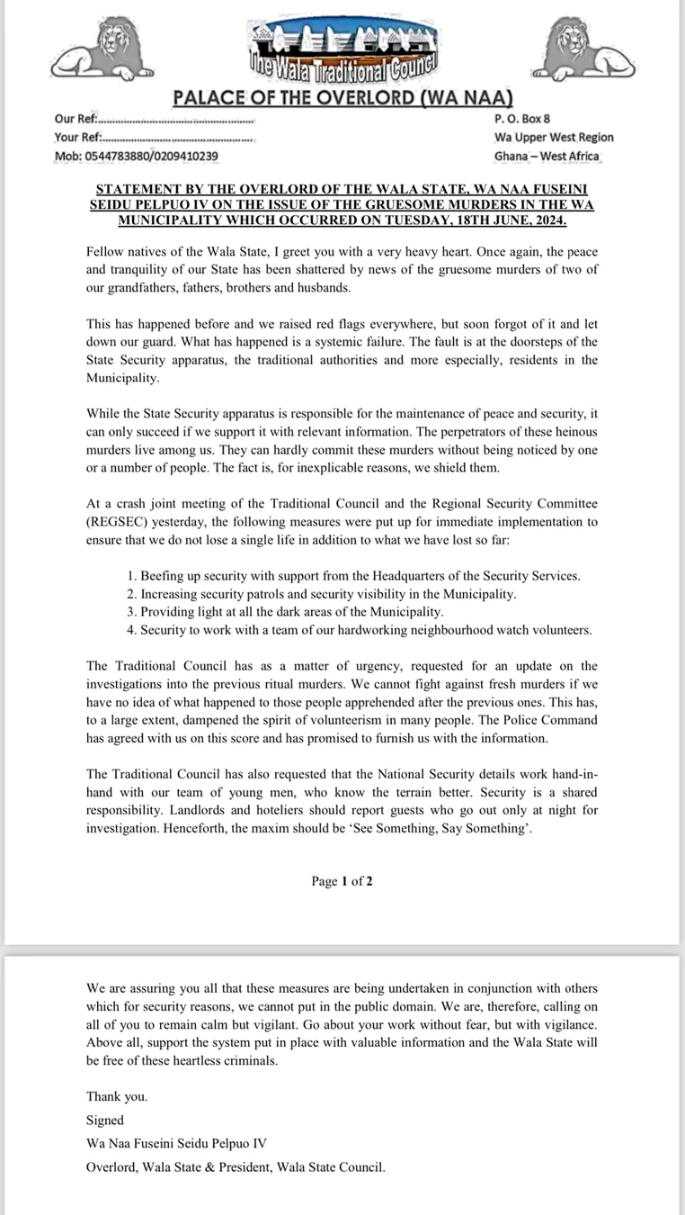 The overlord of the Waala Traditional Area, Naa Fuseini Seidu Pelpuo IV, is demanding a comprehensive report from the Police on the spate of killings in