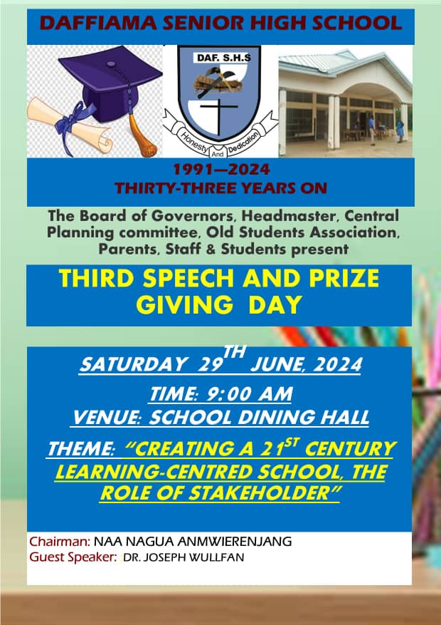 Dafiama Senior High School in the Upper West Region, headed by Mr. Osbert Dambia is set to organize a Speech and Price Giving ceremony on the 29th of June 2024.