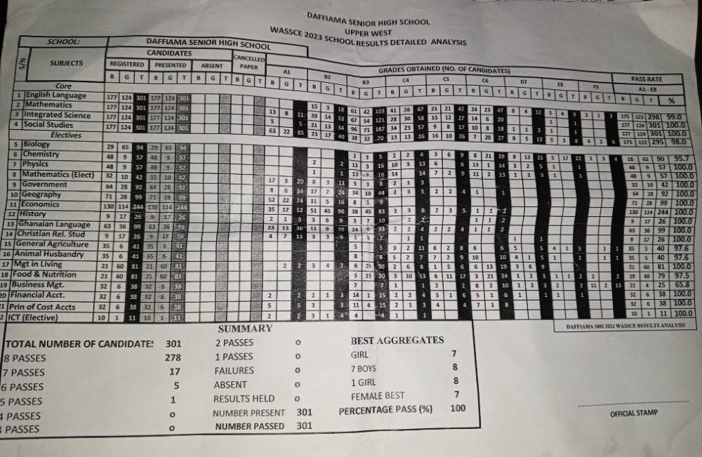 Daffiama SHS in the Daffiama-Bussie-Issa District of Upper West Region has Recorded a remarkable 100% in WASSCE Performance 2023, this is the fifth time the school has recorded such a performance.