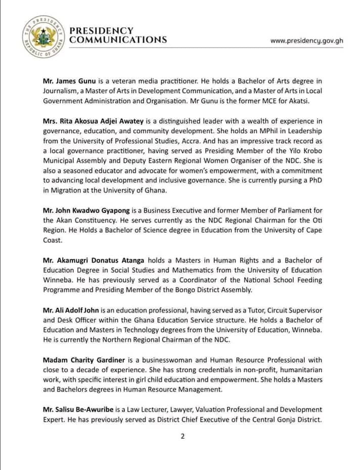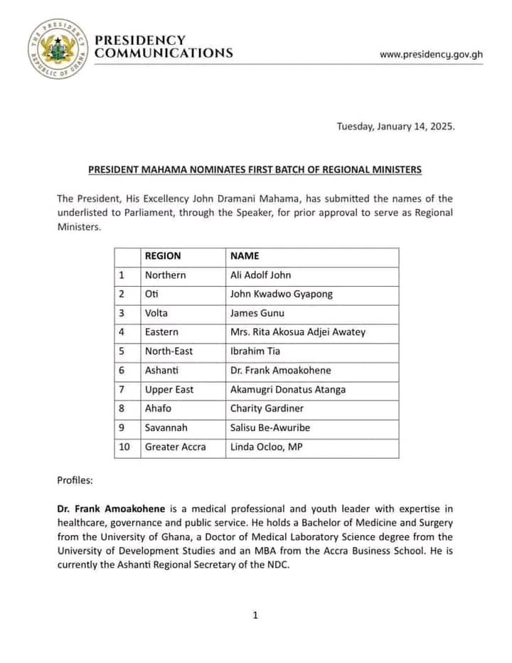 The President, His Excellency John Dramani Mahama, has submitted the names of the underlisted to Parliament, through the Speaker, for prior approval to serve as Regional