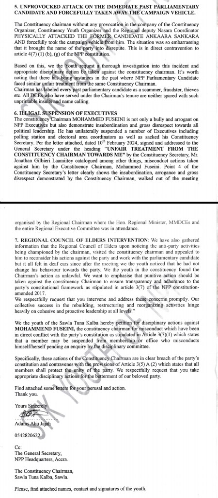 A petition has been written demanding the suspension of the party’s Constituency Chairman, Mr. Mohammed Fuseini over several Anomalies including misconduct.