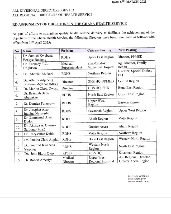 In addition, Dr. Robert Amesiya, the Medical Director of the Upper West Regional Hospital, has been reassigned as the Acting Regional Director of Health Service (RDHS) for the Greater Accra Region. Meanwhile, Dr. Josephat Ana-Imwine Nyuzaghi will step into the role of RDHS for the Upper West Region.