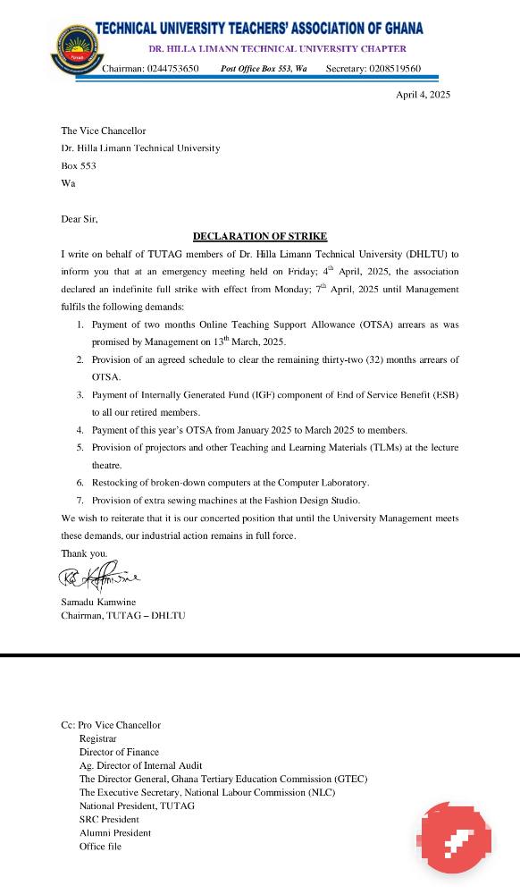 In a Letter Dated 4th April 2025, Technical University Teachers Association of Ghana (TUTAG) of Dr. Hilla Limann Technical University have laid Down their tools requesting for some demands to be met at the University.
