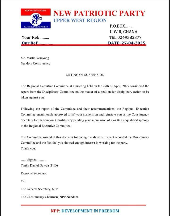 The Nandom Constituency Secretary of the New Patriotic Party (NPP), Martin Wuoyang, has been reinstated following unanimous approval by the party’s Upper West Regional Executive Committee.