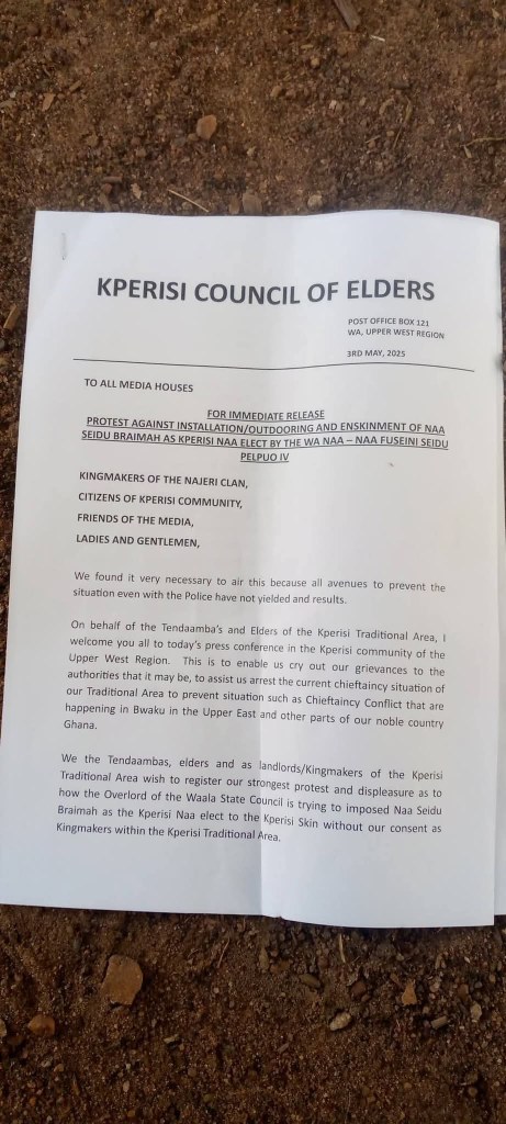 In a letter dated, 3rd May 2025, the Kperisi Council of Elders have issued a statement, expressing displeasure and protest over what they referred to as an attempt to impose a Chief on Kperisi Skin.