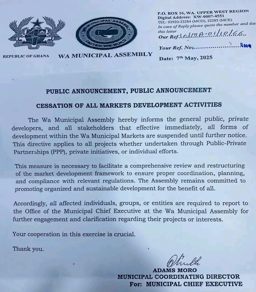 The Wa Municipal Assembly hereby informs the general public, private developers, and all stakeholders that effective immediately, all forms of development within the Wa Municipal Markets are suspended until further notice. This directive applies to all projects whether undertaken through Public-Private Partnerships (PPP), private initiatives, or individual efforts.