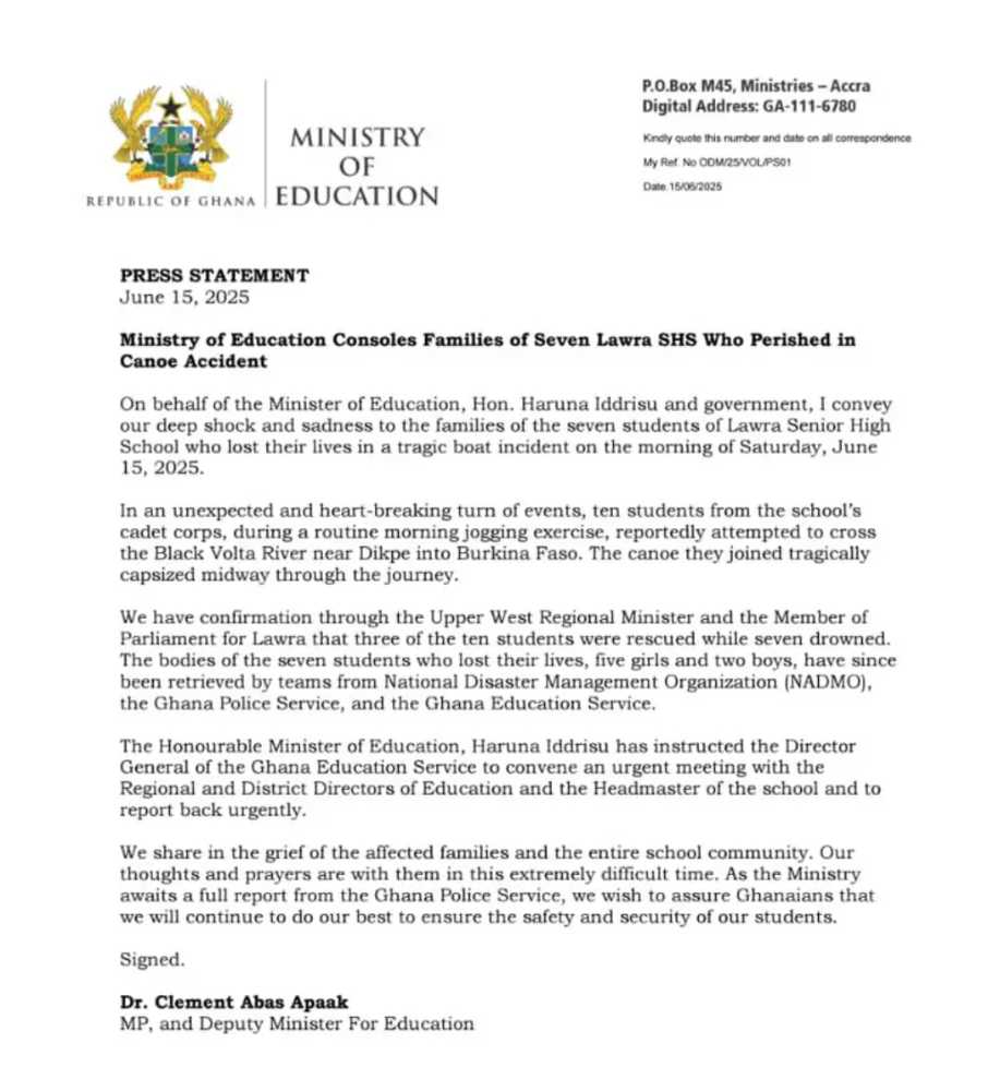 On behalf of Minister of Education Haruna Iddrisu, Deputy Education Minister Dr. Clement Apaak has extended condolences to the families of the seven Lawra Senior High School students who lost their lives in a canoe accident.