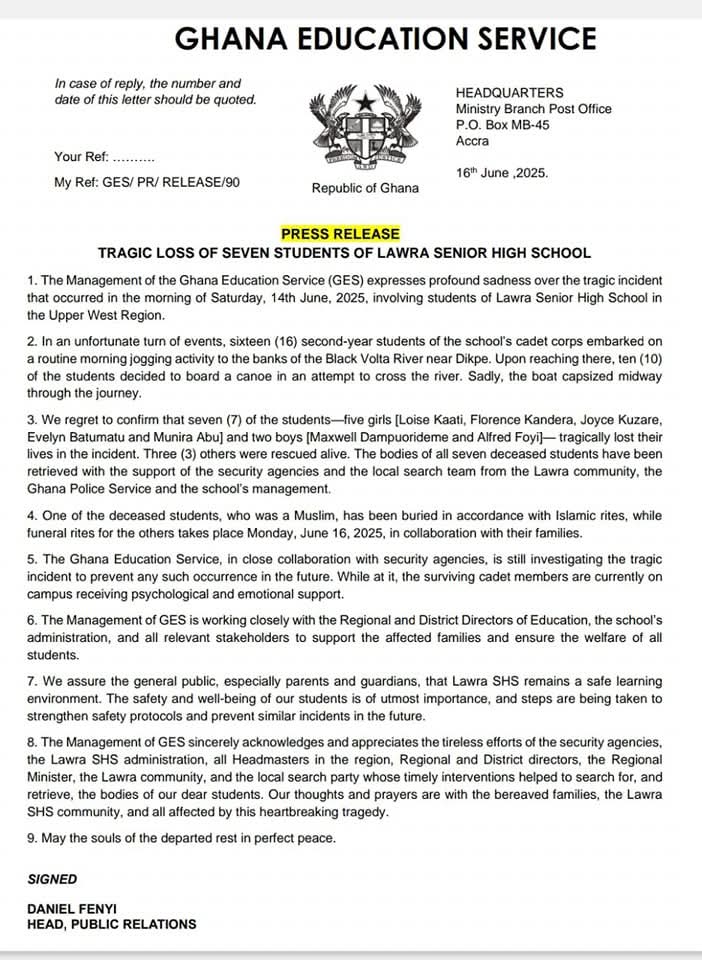 The Ghana Education Service ya issued a statement after 7 Lawra SHS Students were found Dead after attempting to cross the Dikpe River in Lawra Municipality on 14th of June 2025.