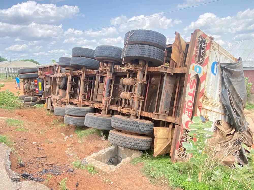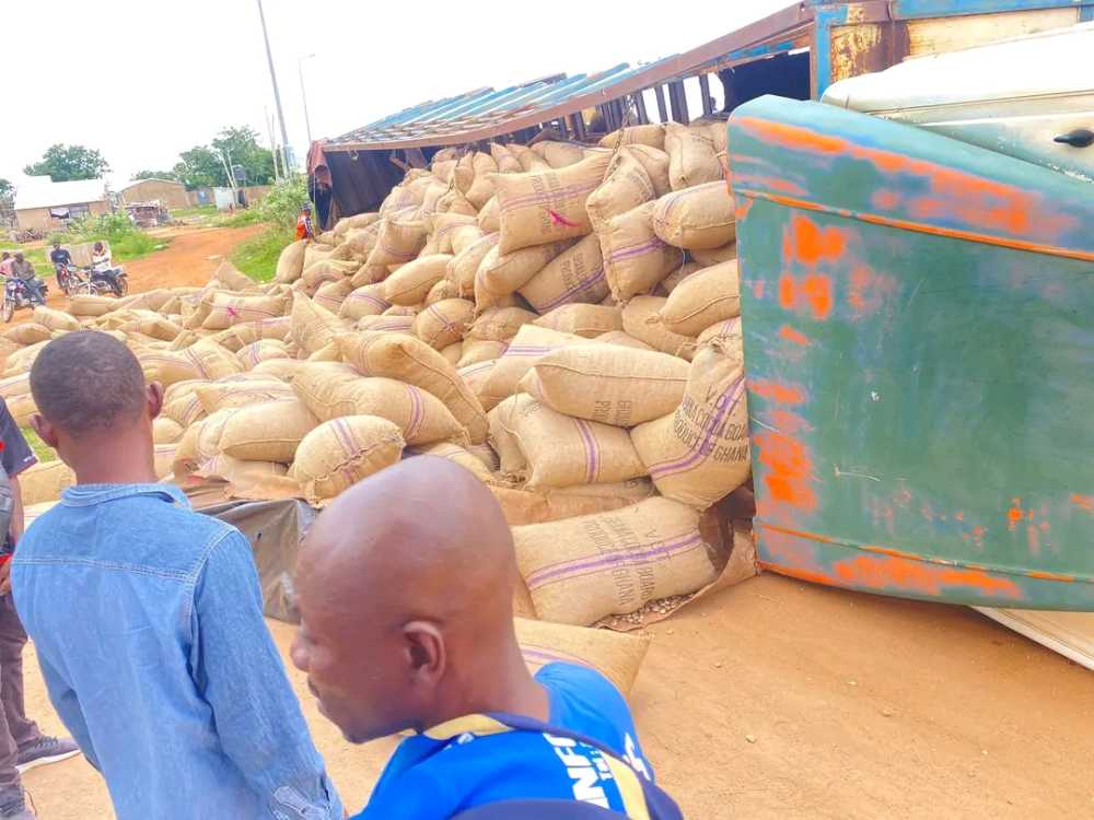 A long vehicle with registration number 2503D-09, transporting sacks of cashew seeds from Burkina Faso, has veered off the road and fallen off the curve near the Wa Airport.