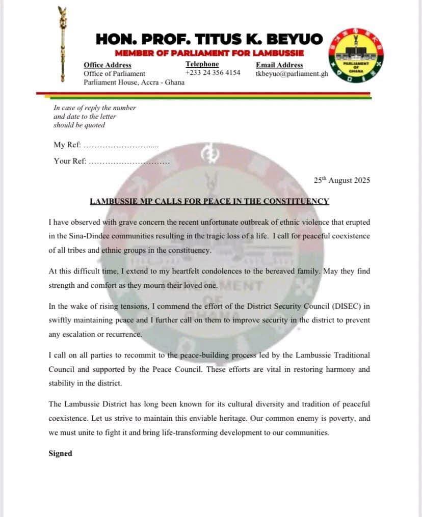 Hon. Prof. Titus K. Beyuo, Member of Parliament for Lambussie, has issued a heartfelt appeal for peace following a recent outbreak of ethnic violence between the Sisa-Dindee communities, which resulted in a tragic loss of life.
