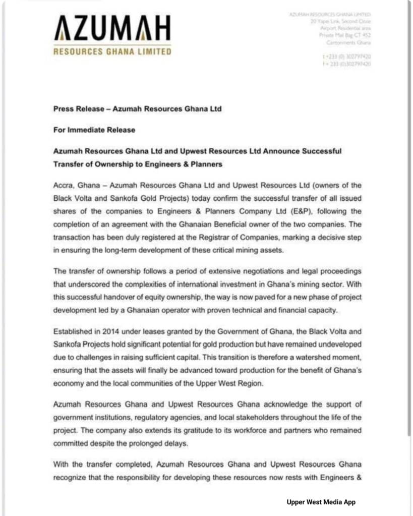 Indigenous mining contractors, Engineers & Planners (E&P), have completed the acquisition of the equity in Azumah Resources Ghana Ltd and Upwest Resources Ghana Ltd.