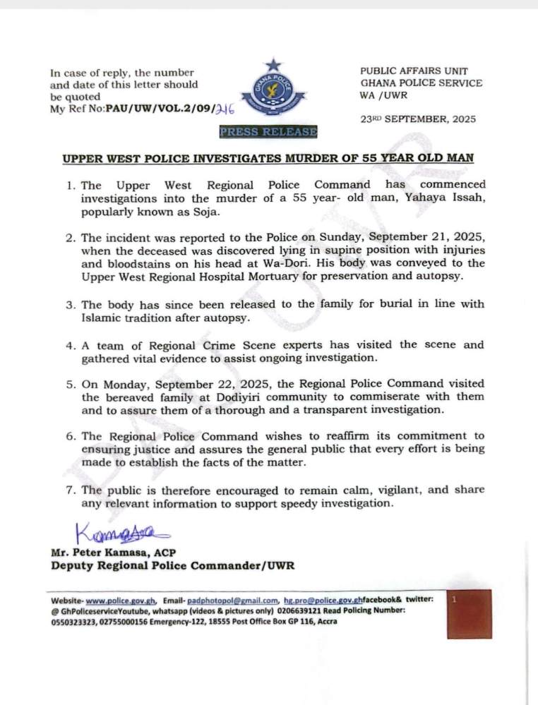 According to a press release issued by the Public Affairs Unit of the Ghana Police Service in Wa, the incident was reported on Sunday, September 21, 2025, after the deceased was found lying in a supine position with visible head injuries and bloodstains at Wa-Dori.