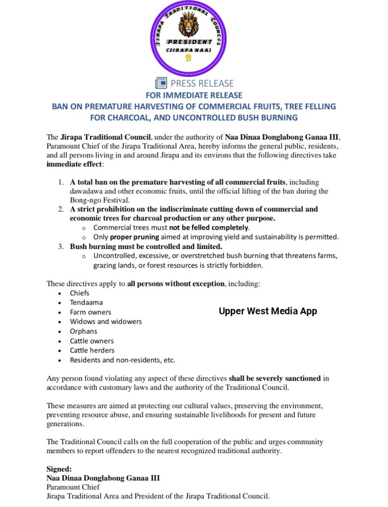 The Jirapa Traditional Council, under the authority of Naa Dinaa Donglabong Ganaa III, Paramount Chief of the Jirapa Traditional Area, hereby informs the general public, residents, and all persons living in and around Jirapa and its environs that the following directives take immediate effect: