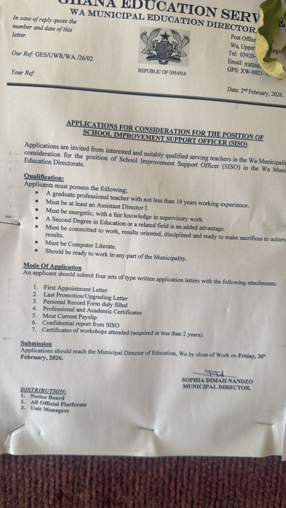Applications should reach the Municipal Director of Education, Wa by close of Work on Friday, 20 February, 2026.