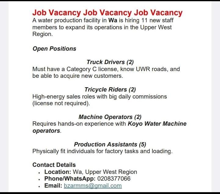 A water production facility in Wa is hiring 11 new staff members to expand its operations in the Upper West Region.